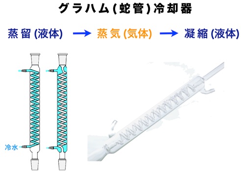 有機化学の研究室では、沸点と凝集点の差を巧みに使って、混合液から特定の液体成分を分ける(分留する)グラハム冷却器と呼ばれる冷却管がごく普通に使われています。原理は、液体である冷水と高温の気体との間での熱交換です。