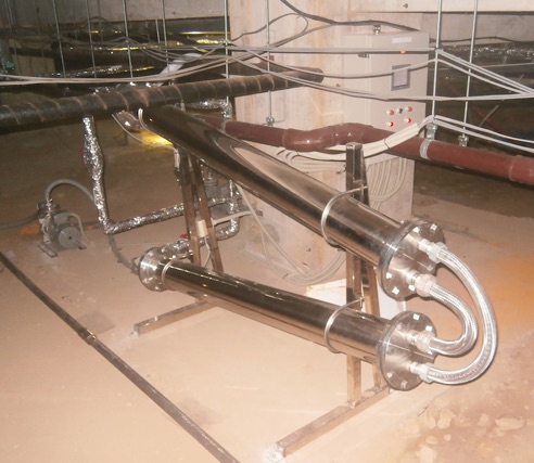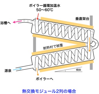 しかし実際に浴場を造るとなると、10分間もかけて湯煎で加温するわけにはゆきません。しかも、遊離炭酸ガスが絶えず抜け、湯温も下がるため、それらを補うためには、冷鉱泉の毎分数十〜60リットル程度の連続加温が必要となります。
