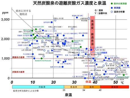 炭酸泉、特に高濃度炭酸泉とは、お湯もしくは水に炭酸ガスが40℃付近での過飽和濃度(水1kgに1グラムのCO2炭酸ガス=二酸化炭素:およそ1,000ppm)もしくはそれ近くに溶け込んでいる水のことです。浸かれば、皮膚や体毛に細かな泡が付き、湯温が低くても浸漬部分は真っ赤になります。体感温度として、2〜3℃実際の温度より温かく感じます。