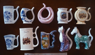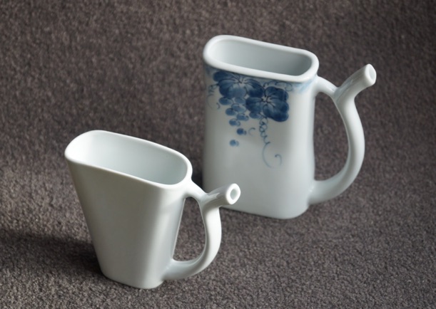 基本的な形状は、高温の飲泉にも合理的で、握り手にもなるカップの底からストロー状の吸い口が上部まで立ち上がっており、小さな子どもでも持ちやすく、揺らしても溢れにくいようにカップは押しつぶされたように平たい。ただし、目盛は付いていない。容量は100〜300mℓで、価格は500〜1,000円、チェコの物価水準が日本の2/3程度なので、実質700〜1,500円位。