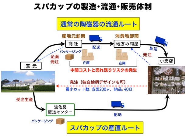 スパカップは、従来の陶磁器の製造販売ルートではなく、製造元(窯元)産直スタイルを取り、また個人で購入を希望される方々、数百単位で販売したい温泉地の小売店の方々のため、ご当地デザインもオーダーメードできるような製造工場直売システムを構築した。